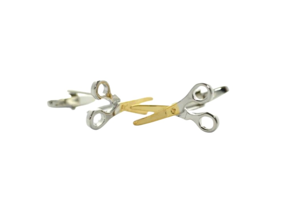 Manžetové knoflíčky ve tvaru nůžek v stříbrno-zlatém provedení.