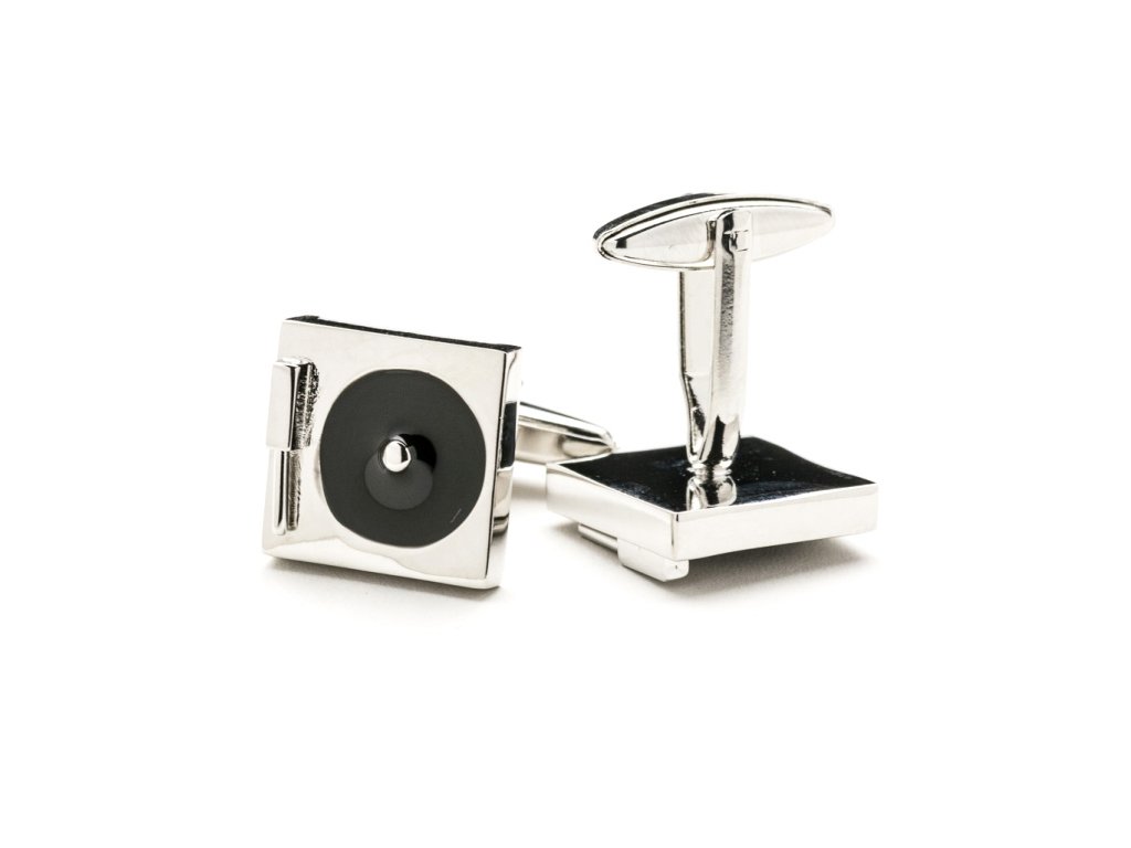 Manžetové gombíky sú špecifické svojím tvarom, ktorý imituje prehrávač gramofónových dosiek.