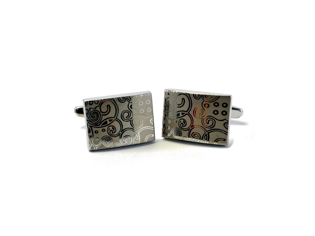 Obdĺžnikové manžetové gombíky striebornej farby s dizajnovým ornamentom.
